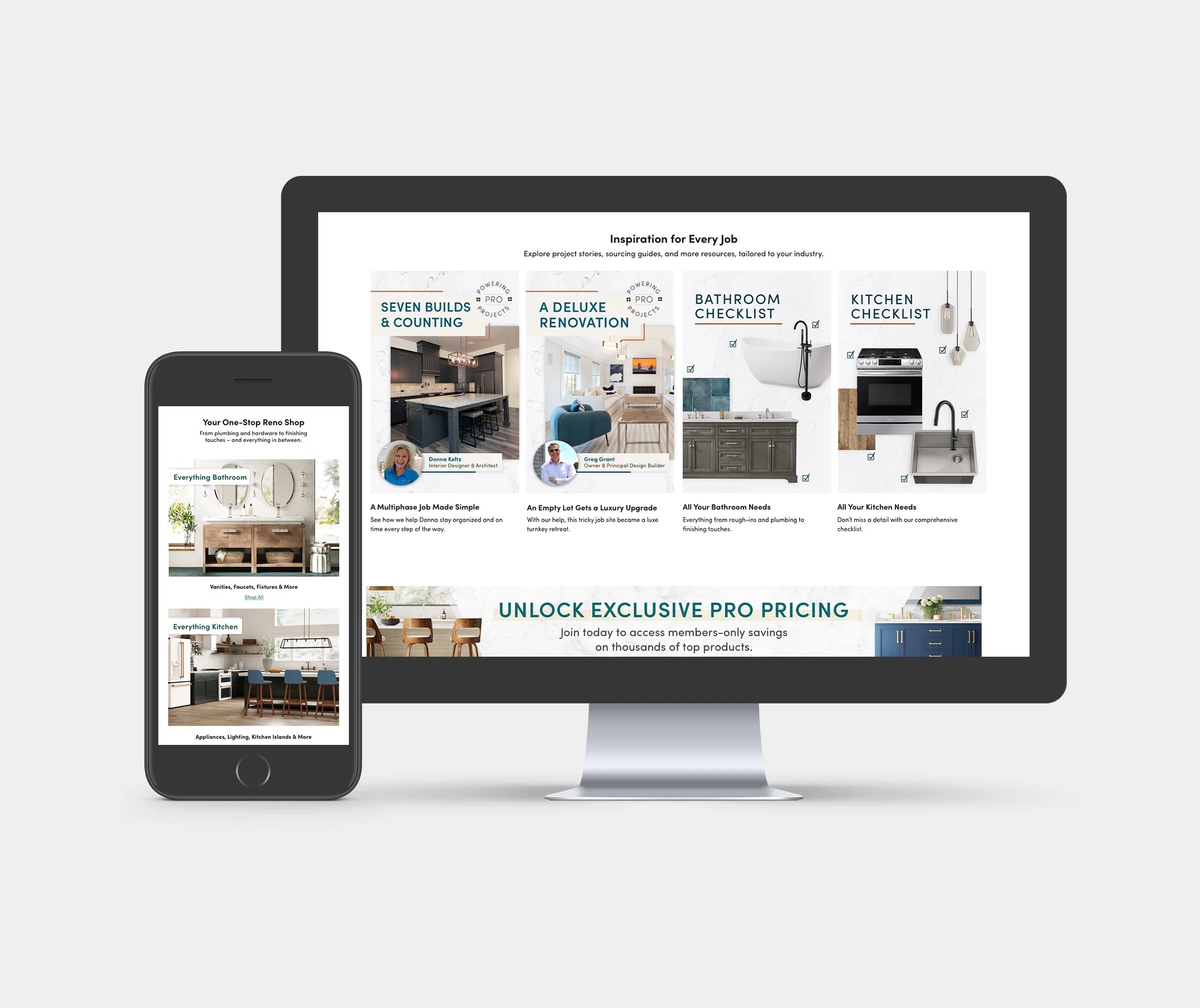 Powering Pros Landing Page, Desktop & Mobile Available only to Wayfair Professional customers, specifically Contractors and Interior Designers. Highlights existing customer projects and inspirational content.